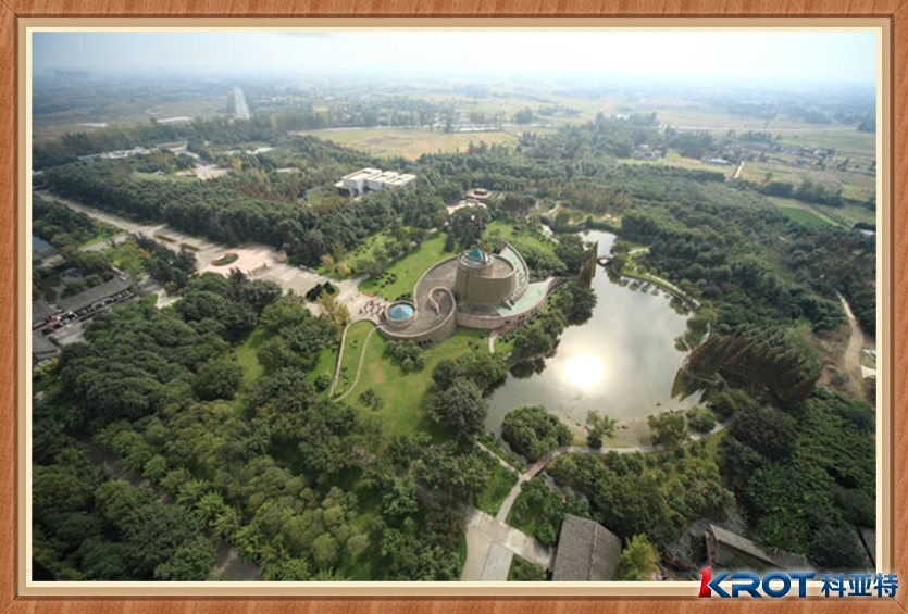 三星堆博物館占地面積約33公頃,綠化面積達80%以上,館區內環境優美、布局動靜得宜,曲徑敞道,垂柳依依、古蜀奇葩、湖光島影無處不體現了人文與自然完美結合、飄逸自然、渾然天成的川西園林特色。博物館主體建筑外形追求與地貌、史跡及文物造型藝術相結合的神韻,融原始意味和現代氣息為一體。一展館建筑為半弧形斜坡生態式建筑,張揚人與自然和諧共生的人文精神,二展館建筑為三部一體的變形螺旋式建筑,其整體具有“堆列三星”與“人類歷史演進歷程”的雙重象征,館外還有氣勢灰宏的仿古祭祀臺和供現代文體活動的大型表演場與展館建筑遙相呼應,表達了三星堆文化蒼古雄渾、博大精深的歷史意蘊。